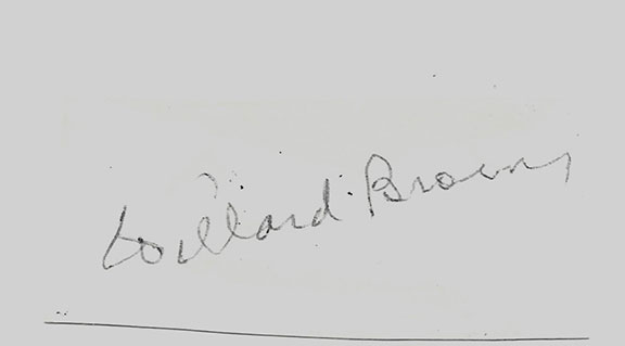 BROWN, Willard (1915-1996). Professional baseball player, outfielder in the Negro Leagues for the Kansas City Monarchs and Major League Baseball St. Louis Browns. Inducted into the Baseball Hall of Fame 2006. Fabulous ink signature on a 1.5”x3” slip. Affixed to a 3”x5” card. Authentic signatures of Brown are quite uncommon and this is a fine example.............$1,100.00
