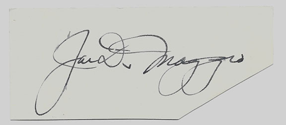 DiMAGGIO, Joe  (1914-1999). American professional baseball player who spent 13 years with the New York Yankees. Nicknamed Joltin Joe. Known for his 56th game hitting streak in 1941. Inducted into the Baseball Hall of Fame 1955.  Wonderful, vintage ink signature on a 1.5”x4” slip. Bottom right corner trimmed otherwise a very fine, clean example.............$150.00
