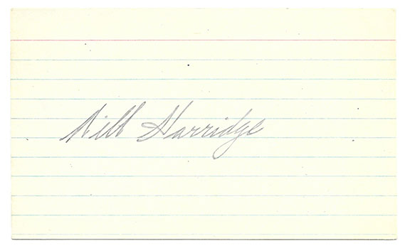 HARRIDGE, Will (1883 -1971). President of the American League 1931-1959. Credited with creating the Baseball All Star Game in 1933. Inducted into the Baseball Hall of Fame 1972.  Fine vintage ink signature of the lined side of a 3”x5” card.............$175.00