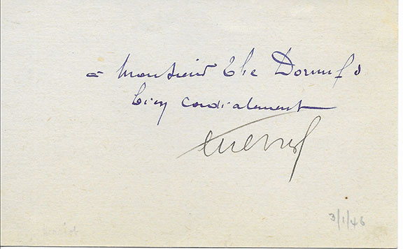 HERRIOT, Edouard (1872- 1957). Premier of France (1924-25) June-Dec. (1932). President of the National Assembly. Choice signature on a large card with an inscription in another hand. Dated in pencil 3/1/46.....................$50.00![]() |