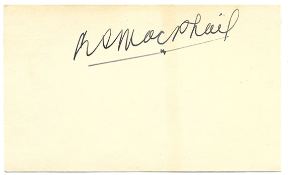 MacPHAIL, Larry (1890-1978). American baseball player, First African American to hit a home run in the American League. Inducted into the Baseball Hall of Fame 1978. Be cautious when purchasing a MacPhail signature authenticated by one of those third party authenticators when even MacPhail’s signature is spelled wrong. Bold, vintage ink signature on a 3”x5” card.............$650.00