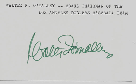 O’MALLEY, Walter E. (1903-1979). American sports executive who owned the Brooklyn/Los Angeles Dodgers. Inducted into the Baseball Hall of Fame 2008. Excellent, very bold green ink signature on a 3”x5” card.  Two lines of type at the head of the card, In very fine condition.............$275.00