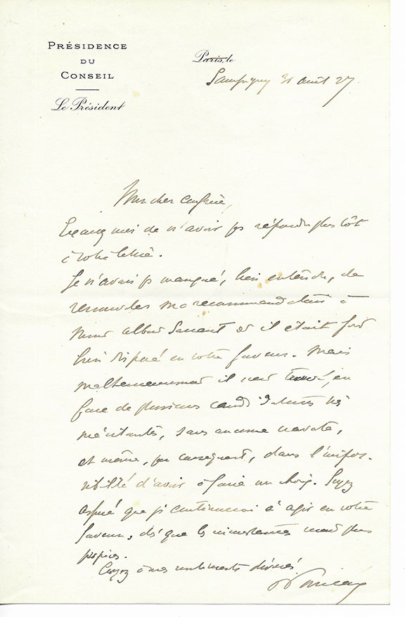 POINCARE, Raymond (1860-1934) President of France (1913-20) and three times as Prime Minister. Autograph letter signed, one full page on the imprinted stationery of Presidence Du Conseil, Le President. He writes in reference to a Cabinet meeting and the proper dress. A fine full page example..............$125.00![]() |