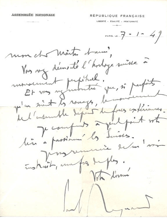 REYNAUD, Paul (1878-1966). Reynaud became Premier of France in March 1940 just a few weeks before the Nazi invasion of France. He was held because of resistance to the Germans. He was interred by the Vichy Government and in 1943 imprisoned by the Nazi’s. Hitler sentenced him to death, but the execution did not take place and Reynaud was eventually liberated by the American forces in May 1945. A.L.S., on the imprinted stationery of Assemblee Nationale, Republic Francaise, Paris, 7/1/1949. In French Reyanud writes about a change in plans to meet with Swiss representatives, signed with a huge signature. Uncommon in A.L.S. V/G-Fine.....................$150.00