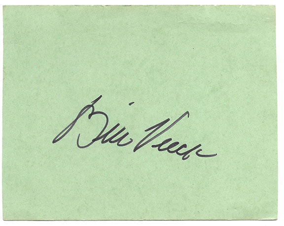 VEECK, Bill (1914-1986) American professional baseball player. Known as the P.T. Barnum of Baseball. Inducted into the Baseball HOF 1991. Fabulous bold signature on a green 3.5”x4.5” cardn.....$110.00