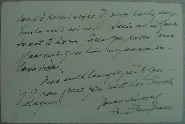 Autograph letter signed, one side and signed once again on the verso. Piece of lined paper measuring appx. 3”x6”: “Montreal, 7/8/14, Dear Sir, Overside, I sign as you wished. Have been extra busy. Best Wished, Yours truly, A.H.R.” On the verso Rostron has signed with the finest full signature one can imagine. For those who would think of it, the page could be trimmed so that one could end up with the closing of the letter signed with initials from one side and the other with a full signature. The letter has one punch hole barely touching the word “extra” and some burn marks from a fire not touching any of the writing. Together with this letter is a Underwood & Underwood magazine photo of Captain Rostron and also several original newspaper articles regarding the Titanic sinking and about a painting sold by Frank Millet who was lost on the Titanic. This letter of Rostron is extremely rare and may be the only letter ever offered containing two signatures $2,950.00