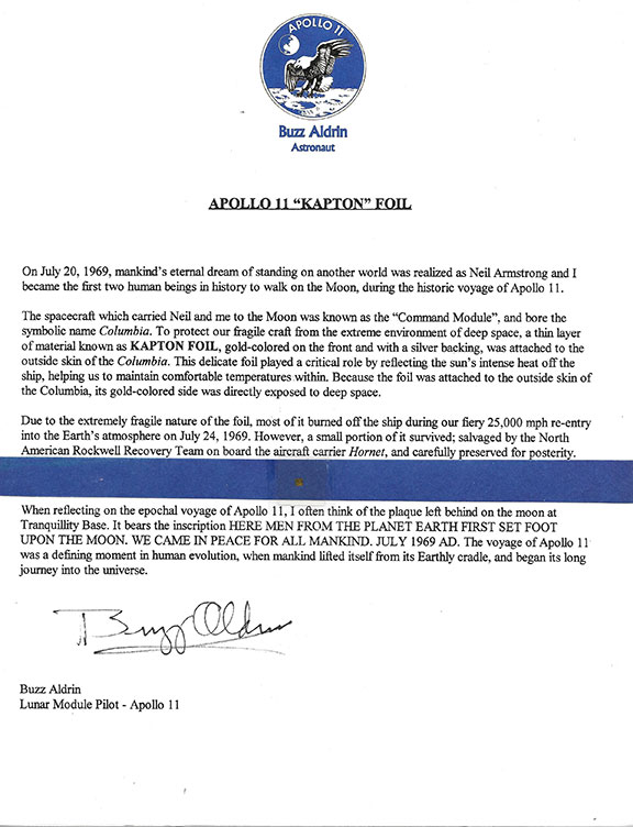ALDRIN, Buzz (1930- ) American astronaut, first of two persons to land on the moon and the second person to walk on the moon. Fabulous typed letter signed on the colorful letterhead of Apollo 11, Buzz Aldrin, Astronaut. Lengthy letter regarding the July 20, 1969 flight to the moon. He continues: “The spacecraft which carried Neil and me to the Moon was known as the “Command Module”, and bore the symbolic name Columbia. To protect our fragile craft from the extreme environment of deep space, a thin layer of material known as Kapton Foil, gold-colored on the front and with a silver backing, was attached to the outside skin of the Columbia. This delicate foil played a critical role by reflecting the sun’s intense heat off the ship, helping us to maintain comfortable temperatures within. Because the foil was attached to the outside skin of the Columbia, its gold-colored side was directly exposed to deep space⦔ He continues: “When reflecting on the epochal voyage of Apollo II, I often think of the plaque left behind on the moon at Tranquillity Base, It bears the inscription HERE MEN FROM THE PLANET EARTH FIRST SET FOOT UPON THE MOON. WE CAME IN PEACE FOR ALL MANKIND, JULY 1969 AD.” Attached to the center of this letter is a piece of Kapton Foil from Apollo 11. The letter is boldly signed “Buzz Aldrin.” Never folded and in mint condition....................SOLD