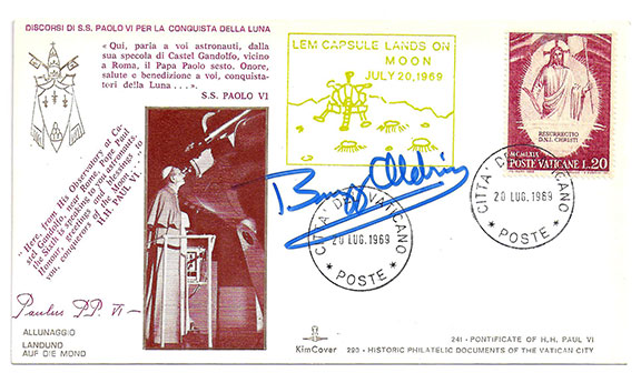 ALDRIN, Buzz (1930- ) American astronaut. Member of the historic Apollo II Mission and the second man to walk on the Moon. Two cachets, one of the “Capsule Lands On Moon, July 20, 1969” and the other of a portrait of Paulus PP VI in his observatory at Castel Gandolfo looking through his telescope. Speaking to the astronauts the Pope sending greetings and blessings “to you, conquerors of the Moon”. Vatican Postage Stamp “Resurrection of Christi” cancelled at the Vatican Post Office, July 20, 1960. Hand signed with a fabulous signature of Buzz Aldrin ............. $275.00