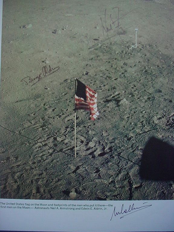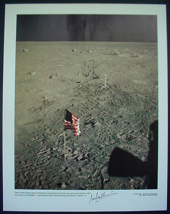 Very unusual and outstanding large color portrait, 11”x14” of the footprint-strewn Apollo II landing site. Most likely taken during the ascent of the lunar module Eagle. Signed by all three astronauts. Published by the National Aeronautics and Space Administration. This can easily be the centerpiece of any Apollo II or space autograph collection. Very fine condition............. $11,500.00