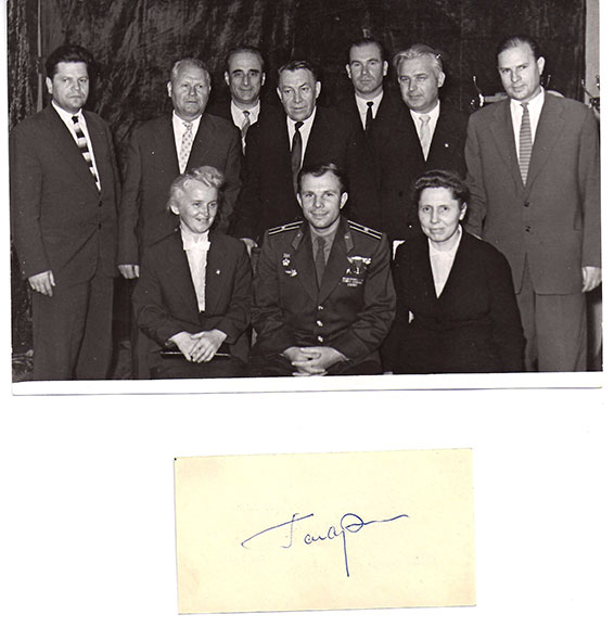 Russian Business card for Vladimir Ampleev, Telegraph Agency of the Soviet Union. Boldly signed by Gagarin on the verso. Together with a photo of Gagarin in uniform along with several others. Vladimir Ampleev met Gagarin and the only thing he had on him for Gagarin to sign was his business card. Both items in fine condition