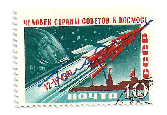 Soviet Postage Stamp of a rocket in flight and a profile portrait of Gagarin. Signed across the stamp with good contrast. Very desirable....SOLD