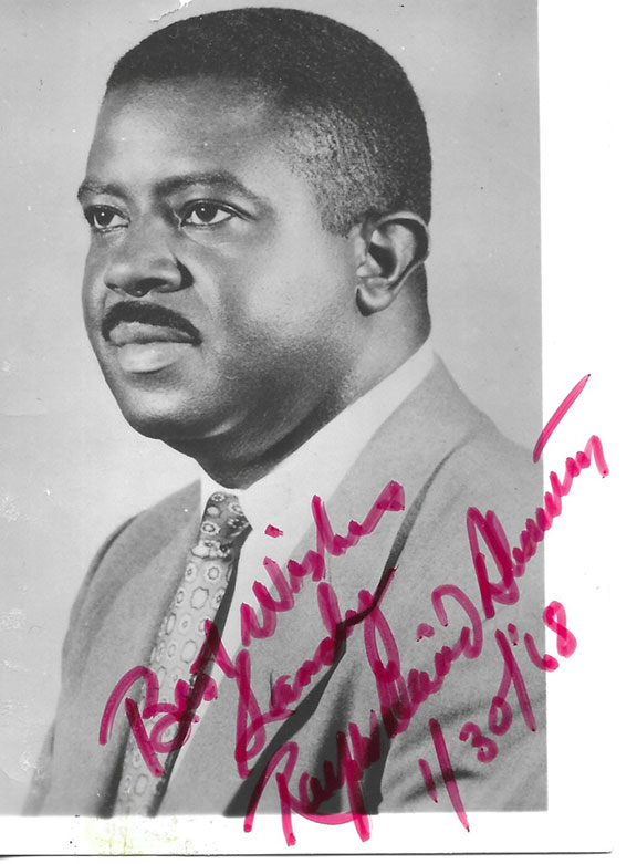 ABERNATHY, Ralph B. (1926-1990). Civil Rights leader. Martin Luther King, Jr. deputy. He organized the Montgomery Bus Boycott. Uncommon photograph, 3.5”x4.75”, B&W, head and shoulders pose, looking quite serious. Inscribed and signed and dated with a three-word sentiment in bold red ink. “Best wishes Sandy, Ralph David Abernathy 1/30/68.” Two sides of margins trimmed otherwise in fine condition.............SOLD