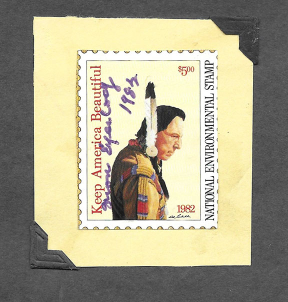 CODY, Iron Eyes (1904-1999). American Hollywood Cherokee Indian Chief, actor and leader in the Environmental Movement. Wonderful, large $5.00 Keep America Beautiful non postal issued stamp, 1982, Color portrait of the Chief, half length, profile pose. Boldly signed and dated “1982” by the Chief who was alive during the time this stamp was issued. In fine condition affixed to a larger slip. Most unusual.............$75.00