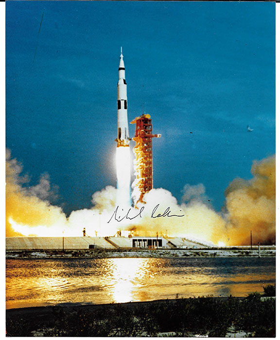 COLLINS, Michael (1930 - ) Born in Rome, an American astronaut. Test pilot, Maj. General in the USAF and artist. He flew into space twice. ON the Apollo 11 trip to the moon along with Armstrong and Aldrin he was command module pilot. Collins was the first person to have performed more than one space walk. Striking color photograph of the launch of Apollo 11. Hand signed with wonderful contrast by Michael Collins. A very uncommon signed photograph................SOLD