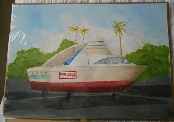 He was on the Apollo 11 moon landing mission in 1969 with crew mates Neil Armstrong and Buzz Aldrin. Collins orbited the moon while Neil and Buzz spent a day on the moon’s surface. Original watercolor, “Broken Dreams”, measures 14”x20” of a boat se up on blocks with a posted 4 Sale sign. Palm trees and heavy vegetation in the background. Signed by Collins and dated “IV-08”