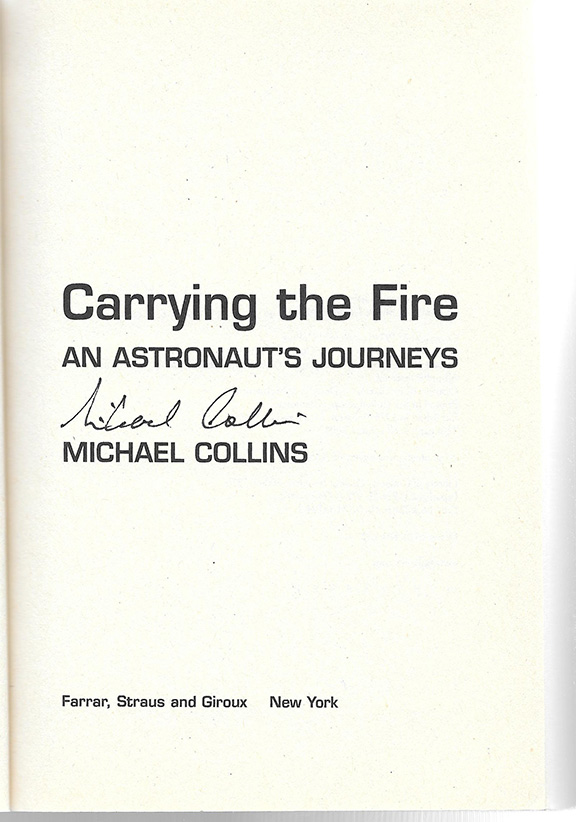 COLLINS, Michael (1930- ) American astronaut, test pilot. Member of the 3 man team aboard Apollo XI. Collins piloted the command space craft as Armstrong and Aldrin walked on the moon. His book (Memoir): “Carrying The Fire/ An Astronaut’s Journeys.” Farrar, Straus & Giroux, New York, 2009. Four hundred seventy-eight pages, illustrated. This paperback is the 40th Anniversary Edition, printed in commemoration of Collins, Armstrong and Aldrin’s 1969 lunar landing. Forward by Charles A. Lindbergh. Signed, in ink, by Michael Collins on the title page. Very uncommon to be found signed. In near mint condition.......................SOLD