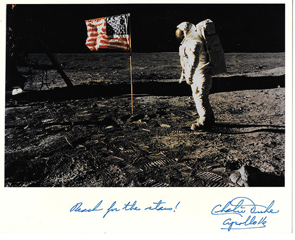 DUKE, Charlie (1935- ). American astronaut, Lunar Module Pilot for Apollo 16, tenth person to walk on the moon. Color photograph, 8”x10” taken by Neil Armstrong showing Buzz Aldrin looking at the first Lunar American Flag at Tranquility Base on July 20, 1969. On the lower margin Duke has written: “Reach For The Stars! Charlie Duke Apollo 16.” In Mint condition.................... $150.00