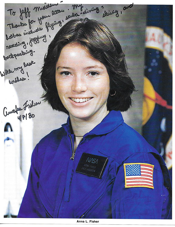 FISHER, Anna L. (1949- ) Nasa Asronaut, known as the First Mother to fly in space. Official NASA color photograph of Fisher, 8”x10”. Lengthy presentation inscription signed: “To Jeff Middleton- Thanks for your letter, My hobbies include flying, scuba diving-reading, jogging, backpacking. With my best wishes! Anna L. Fisher 4/7/80.” In fine condition.....$35.00![]() |