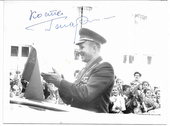 GAGARIN, Yuri (1934-1968). The first person to enter space as a space traveler. Cosmonaut Gagarin flew into space on April 12, 1961, at a speed of 17,000 mph. His voyage lasted one hour and forty-eight minutes in his Vostok Space Craft. This hero of the Soviet Union was killed in a plane accident during a training mission. He was only 34 years old. One of a kind, original photograph 3.5”X4.5” of Gagarin, dressed in his uniform while riding in his car during a parade. Along the parade route appears to be mostly pre-pioneer Soviet children of seven years and older preparing for their entry into the Pioneer Cosmonaut organization. The photograph is inscribed: “To Kostya, Gagarin.” This photograph was purchased from Kostya, who was the son of one of the Russian Embassy Representatives in Paris. He said his father was a member of the KGB. Interesting one of a kind piece and in excellent condition. SOLD