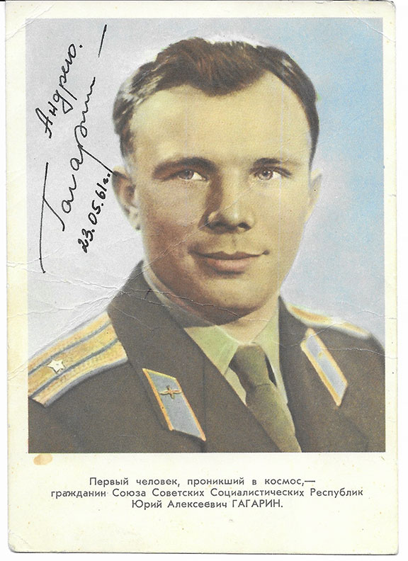 GAGARIN, Yuri (1934-1968). The first person to enter space as a space traveler. Cosmonaut Gagarin flew into space on April 12, 1961, at a speed of 17,000 mph. His voyage lasted one hour and forty-eight minutes in his Vostok Space Craft. This hero of the Soviet Union was killed in a plane accident during a training mission. He was only 34 years old. Color portrait, 4”x6”, head and shoulders pose in uniform. Fine bold inscription on the light area of the sky. “To Andrew, Gagarin, May 23, 1961.” Some very light creases otherwise a very good example. Nice oversize portrait with an uncommon inscription and uncommon date. $1,295.00
