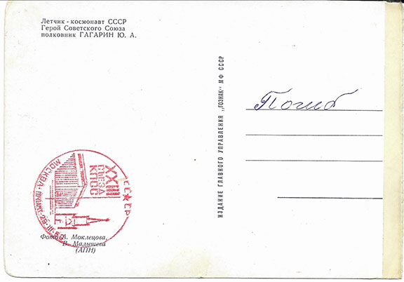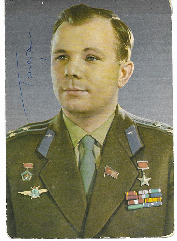 GAGARIN, Yuri (1934-1968). The first person to enter space as a space traveler. Cosmonaut Gagarin flew into space on April 12, 1961, at a speed of 17,000 mph. His voyage lasted one hour and forty-eight minutes in his Vostok Space Craft. This hero of the Soviet Union was killed in a plane accident during a training mission. He was only 34 years old. Color portrait of Gagarin, in uniform, on a Russian postcard. Measures 4”x6” and signed with a fine signature on the lighter portion of the card. Rubber stamp of the 23rdCongress of the Communist Party held in Moscow. Corners a little rounded and a small strip of clear tape across the top not detracting from the overall appearance. Desirable in color portraits especially of this size. $1,100.00