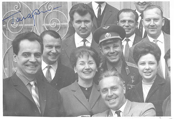 GAGARIN, Yuri (1934-1968). The first person to enter space as a space traveler. Cosmonaut Gagarin flew into space on April 12, 1961, at a speed of 17,000 mph. His voyage lasted one hour and forty-eight minutes in his Vostok Space Craft. This hero of the Soviet Union was killed in a plane accident during a training mission. He was only 34 years old. Original, one of a kind informal photograph of Gagarin in uniform with the members/representatives of the Russian Embassy in Paris. Boldly signed on the upper left clear portion of the photograph. In fine condition. $895.00