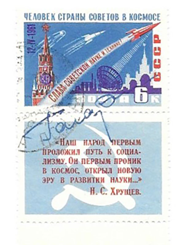 GAGARIN, Yuri (1934-1968). Cosmonaut Gagarin flew into space on April 12, 1961 at a speed of 17,000 mph lasting one hour and forty-eight minutes in his Vostok space craft. This Hero of the Soviet Union was killed in a plane accident during a training mission. Original colorful pair of Soviet postage stamps commemorating Gagarin’s launch and space travel. Hand signed by Gagarin in blue ink across the stamp. In excellent condition......$475.00