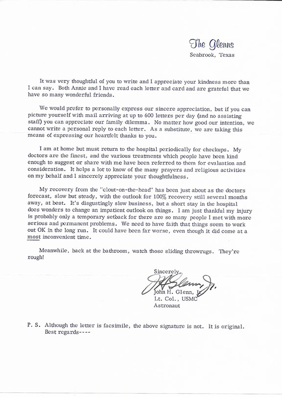 GLENN, John (1921-2016). One of NASA’s original seven astronauts and the first U.S. astronaut to orbit the earth on Feb.20, 1962. His flight on the Friendship 7 orbited the earth three times. Glenn was a U.S. Senator which lasted four terms. T.L.S. on The Glenns, Seabrook, Texas letterhead. No date but circa early 1964. In part: “...with mail arriving up to 600 letters per day... you can appreciate our family dilemma. No matter how good our intention, we cannot write a personal reply to each letter. “....I am at home but must return to the hospital periodically for checkups. My doctors are the finest, and the various treatments which people have been kind enough to suggest or share with me have been referred to them for evaluation and consideration. It helps a lot to know of the many prayers and religious activities on my behalf and I sincerely appreciate your thoughtfulness. My recovery from the “clout-on-the-head” has been just about as the doctors forecast, slow but steady, with the outlook for 100% recovery still several months away, at best. It is disgustingly slow business, but a short stay in the hospital does wonders to change an impatient outlook on things. I am just thankful my injury is probably only a temporary setback for there are so many people I met with more serious and permanent problems. We need to have faith that things seem to work out OK in the long run. It could have been far worse, even though it did come at a most inconvenient time. Meanwhile, back at the bathroom, watch those sliding throwrugs. They’re rough! Very boldly signed “J.H. Glenn, Jr.”