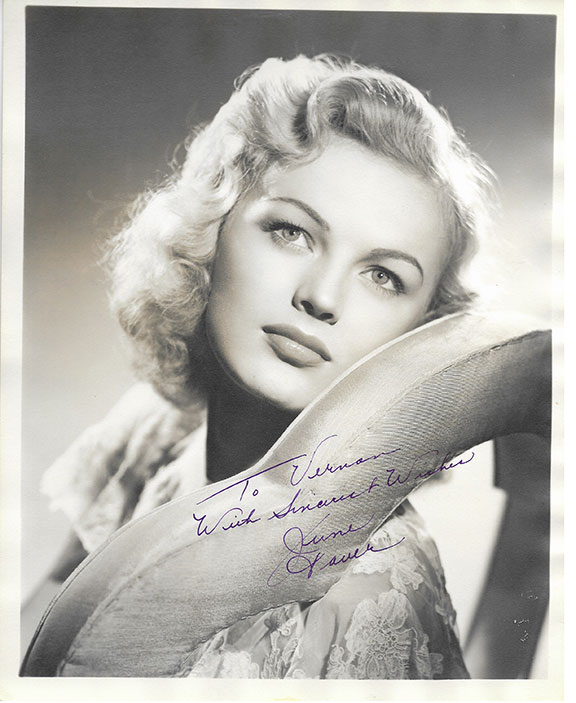 HAVER, June (1922-2005) American film actress, dancer and singer. She was called “The Next Betty Grable). Wonderful vintage 8”x10” head and shoulders pose, looking directly into the camera. Inscribed: To Vernon, with Sincere Wishes, June Haver.” Light rippling along three edges, could be matted out, otherwise in near fine condition.....................$135.00![]() |