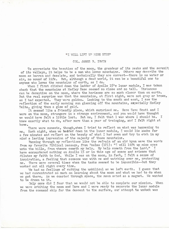 IRWIN, Jim (1930-1991). American astronaut, test pilot. Served as Apollo Lunar Module pilot for Apollo 15. He was the eighth person to walk on the moon and the first and youngest of the moonwalkers to die. Rare typescript, 2 pages “I Will Lift Up Mine Eyes.” A wonderful read regarding his trip to the moon and what he experienced on the moon. One of the nicest signatures of Irwin we have seen, adding in his hand “Apollo 15” and drawing a quarter moon. A fabulous item in very fine condition......................$225.00