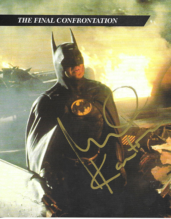KEATON, Michael (1951- ). American actor, multi-talented performer, started as a stand-up comedian. Best known for his title roles as Batman, Birdman and Beetlejuice. Color portrait, 8.5”x10.5” of Keaton from Batman, The Final Confrontation. Boldly signed in gold ink. Refreshing to find a portrait of Keaton bearing a genuine signature. Very attractive for framing.............$250.00
