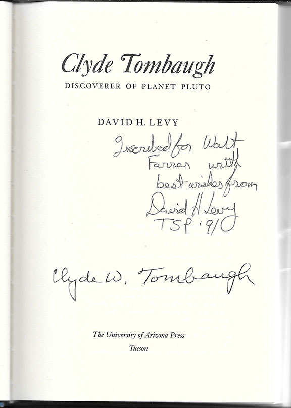 LEVY, David H. (1948- ) Canadian astronomer, science writer, discoverer of seven comets and minor planets. Co-discoverer of Comet-Levy 9 in 1993 which collided with the Planet Jupiter in 1994. His book: Clyde Tombaugh Discoverer of Pluto. The University of Arizona Press, Tucson, 1991, First Edition. Two hundred-eleven pages. Illustrated. Inscribed and signed by the author: “Inscribed for Walt Farrar with best wishes from David H. Levy TSP’91.” Signed just below the author’s inscription: “Clyde W. Tombaugh.” In fine condition with a very good dust jacket in a protective cover...........$775.00