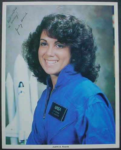 RESNICK, Judy (1949-1986). First Jewish American astronaut. She perished aboard the ill-fated Challenger mission along with six other astronauts. She was the "First Woman Astronaut Candidate to Participate in the T-38 Shuttle Simulation Flight" above White Sands. Attractive NASA Official Photograph of Resnick in her blue jacket with NASA patch posing in front of a model of the Shuttle. Short biography of Resnick printed on verso. Inscribed and signed using a black in pen on a light portion of the photo offering excellent contrast. "Best wishes to Harry! Judy Resnick". One staple indentation top center otherwise in very fine condition.SOLD![]() |
