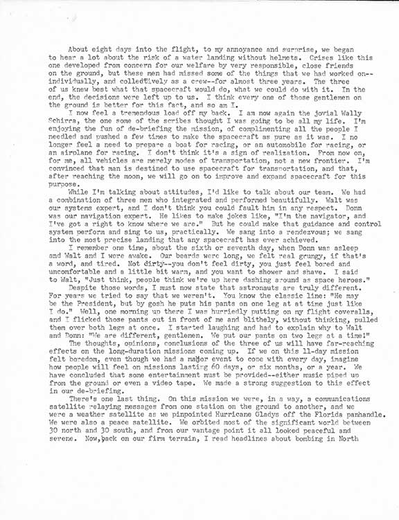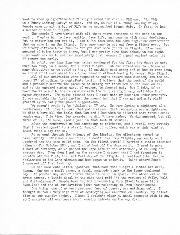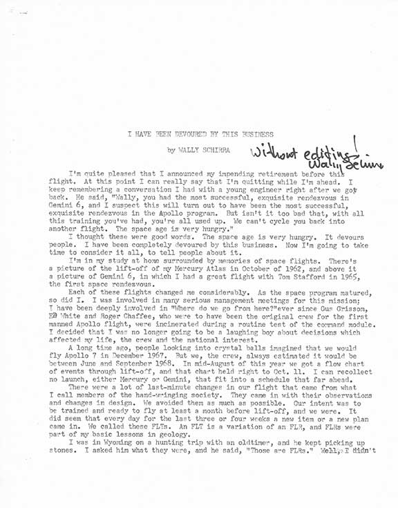 SCHIRRA, Wally (1923-2007) American Naval Aviator, test pilot and astronaut. In 1959 he became one of the seven original astronauts. Wonderful typescript, three and a quarter pages in length. “I Have Been Devoured By This Business”. On page one he writes: “Without editing! Wally Schirra”. Most unusual and in excellent condition......................................$150.00