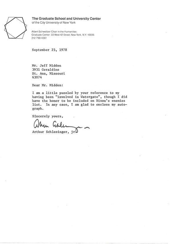 SCHLESINGER, JR., Arthur (1917-2007). American historian, JFK Special Assistant, winner of the Pulitzer Prize. Three T.LS. 1980, 1980 and 1985. On the letterheads of The Graduate School and University Center. On one letter he writes: “I am a little puzzled by your reference to my having been ‘involved in Watergate’, though I did have the honor to be included on Nixon’s enemies list. In any case, I am glad to enclose my autograph.’’ All three letters signed “Arthur Schlesinger, Jr.” All three letters in fine condition.....$95.00