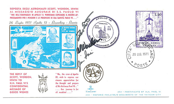 SCOTT, David (1932-), WORDEN, Al (1932-1991) and IRWIN, Jim (1930-1991). Vatican City First Day Cover, affixed with a Vatican Postage Stamp postmarked July 26, 1971. Very colorful cover with a cachet of the three astronauts.. Apollo 15 rubber stamp cachet of the Apollo 15 Launching. Printed message from Pope Paolo VI and also a printed message to the Pope from the three astronauts. Hand signed by Dave Scott, Al Worden and Jim Irwin. A very attractive cover.............................$275.00