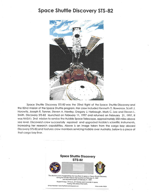 Space Shuttle Discovery STS-82. (Feb.11,1997-Feb. 21, 1997). Colorful card which has attached a piece of payload liner which was flown in space on Space Shuttle Discovery during the STS-82 mission. It spent 9 days, 23 hours, 37 minutes and 9 seconds in space, making 150 orbits of the earth. Card is affixed to a colorful printed description of the Space Shuttle naming the seven crew members including Kenneth D. Bowersox. Additionally, it describes the purpose of this flight (servicing the Hubble Space telescope). This page has illustrated a color photo taken from the cargo bay which features crew members servicing Hubble over Australia. The card attached below contains a piece of that cargo bay liner. In excellent condition.....$65.00