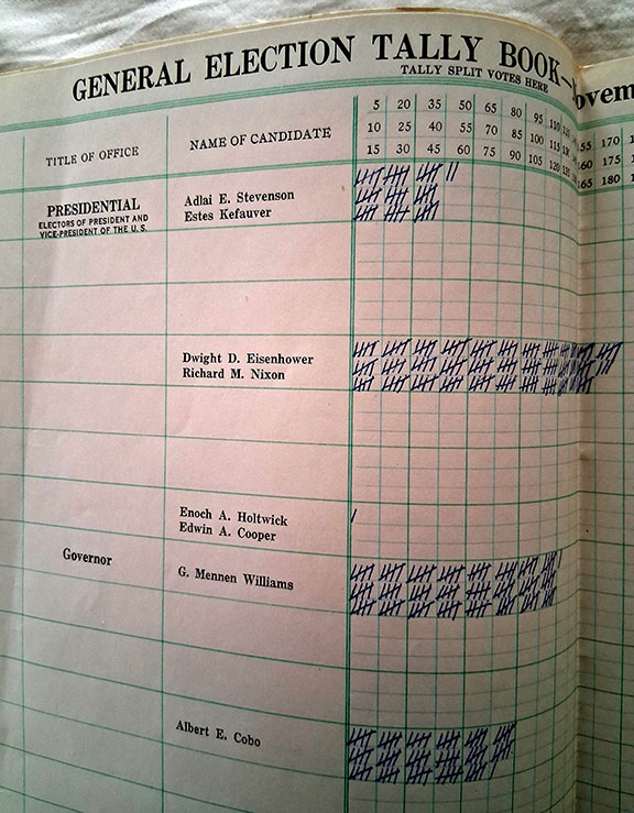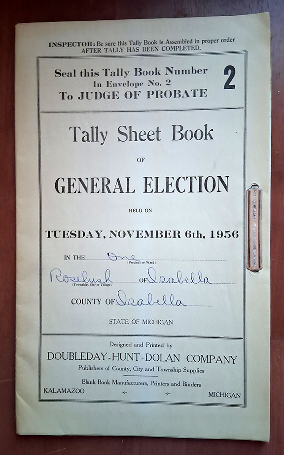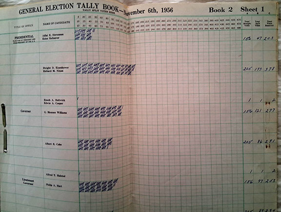 General Election Tally Book, November 6, 1956. Election results filled in by hand, in ink, for President/Vice-President, Adlai Stevenson/Estes Kefauver and Dwight D. Eisenhower/Richard M. Nixon. For Governor Williams/Cobo and for Lieutenant Governor, Hart/Reid and Lindahl. Also, the votes counted for Secretary of State, Attorney General, State Treasurer, Auditor General, Representatives in Congress 10th Dist, State Senator 24th Dist, Representative in State Legislature, Prosecuting Attorney, Sheriff, County Clerk, County Treasurer, Register of Deeds, Drain Commissioner, Coroner, Justice of the Supreme Court, Judge of Probate, Circuit Court Commissioner, and a Proposed Amendment to the State Constitution. This original Tally Book was sent to Judge of probate and is for the One Precinct of Rosebush, Michigan. A very rare opportunity to own original election results in a presidential election. In fine condition.............$100.00