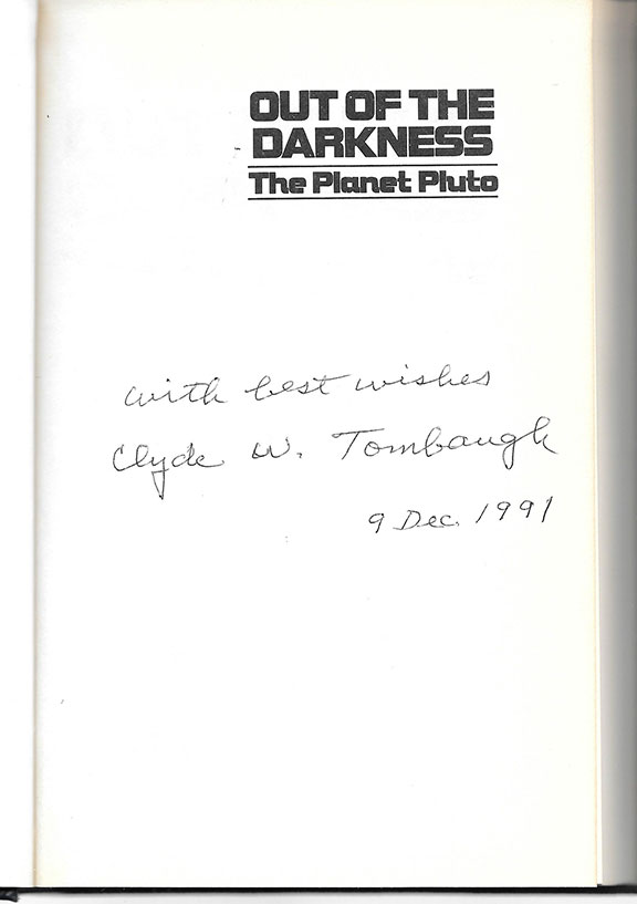 TOMBAUGH, Clyde (1906-1997) Astronomer, who discovered the ninth planet Pluto. His book “Out Of The Darkness, The Planet Pluto”. Stackpole Books, Pa. 1980, First Edition. Two hundred twenty pages, illustrated. Written by Tombaugh on the half title page: “with best wishes Clyde WE. Tombaugh, 9 Dec. 1991”. Fascinating on pages 126, 127, 128 and 129 the author makes additional notes on two of the pages which illustrate the planet Pluto, one signed with his initials. In fine condition with dust jacket. Signed copies of this book are very scarce...$795.00