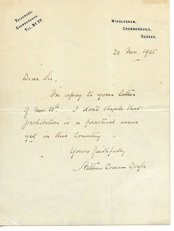 Creator of Sherlock Holmes, talks about Prohibition DOYLE, Sir Arthur Conan (1859-1930). British physician, novelist, detective story writer and the creator of Sherlock Holmes. Autograph letter signed, one page, Windlesham Crowborough, Sussex. 20 Nov. 1925, he writes: “Dear Sir, I reply to your letter of Nov. 13th. I don’t think that prohibition is a practical issue yet in this country. Yours faithfully, Arthur Conan Doyle.” In V.G to Fine condition. $1495.00