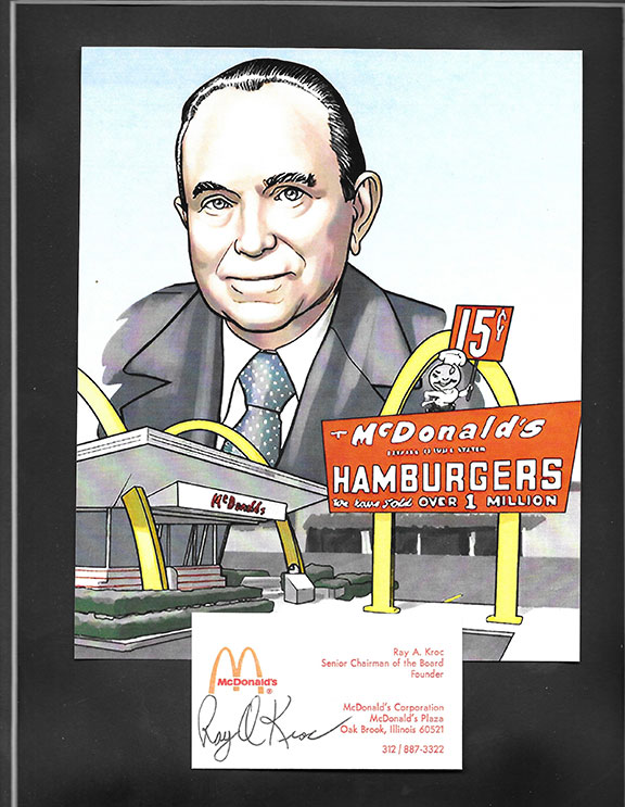 KROC, Ray A. (1902-1984). American businessman who took over McDonald’s in 1954 and built it into the most successful fast food operation in the world. He also purchased the San Diego Padres baseball team in 1974. Scarce McDonald’s business card of Ray A. Kroc, signed with a black ball point pen, "Ray A. Kroc."
