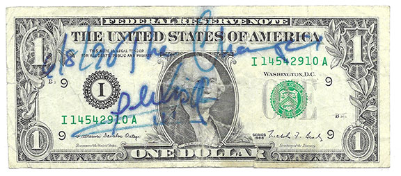 ARGUELLO, Alexis (1952-2009) Three time World boxing Champin. Accused of shooting himself in the heart. His death was declared as a suicide. U.S. $1.00 Federal Reserve Note 1988 boldly signed by the Champion Boxer. In his hand he has added the date 6/8/90 and ‘’The Champ.’’ One small tear not affecting the writing otherwise V/G...........$45.00![]() |