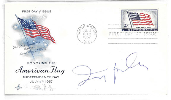 BERLIN, Irving (1888-1989) America’s songwriter and composer. Original name Israel Berlin. One of his many awards was an Academy Award. During his 60 year career he wrote 1,500 songs and scores for 15 Hollywood films. George Gershwin called him “the greatest songwriter that ever lived.” Choice FDC Honoring the American Flag, Independence Day, July 4, 1957. Color cachet of the American Flag. Affixed to the cover is a U.S. 4 cent American Flag postage stamp cancelled First Day of Issue. Washington, D.C. Jul 4, 1957. Boldly signed with a scarce genuine signature of Irving Berlin. Near Mint condition...........$225.00