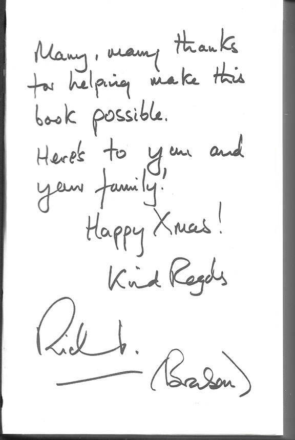 Branson, Richard (1950- ). English business magnate, co-founder of the Virgin Group in 1970. During 1972 he launched Virgin Records which became the world’s largest independent record label. He was knighted in 2000. In 2021 he travelled as a passenger onboard Virgin Galactic Unity 22 to the edge of space. Losing My Virginity, The Autobiography Virgin Publishing, London 1998, First Edition. Four hundred eighty-eight pages, illustrated, many in color. One the blank endpaper he has written: “Mary, many thanks for helping make this book possible. Here’s to you family! Happy Xmas! Kind regards Richard Branson.” In fine condition with dust jacket. Signed copies of his autobiography are scarce and this is a most unusual example .............$250.00