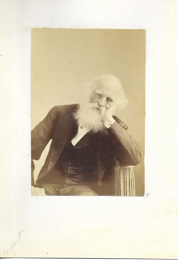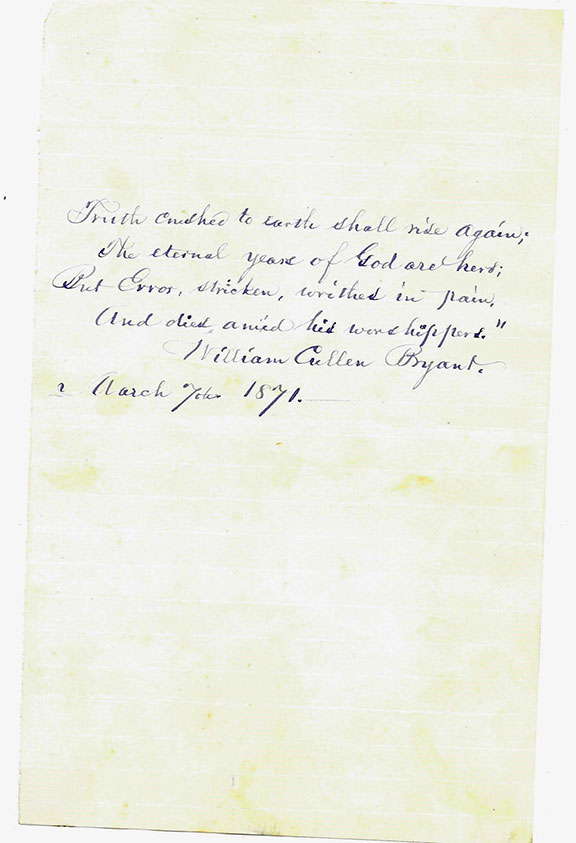 BRYANT, William Cullen (1795-1878) American poet and editor. Autograph quotation signed of his most famous quote. Bryant has penned: “Truth crushed to earth shall rise again; The eternal years of God are hers; But Error, stricken, writhes in pain, And died amid his worshippers.” Signed “William Cullen Bryant, March 7, 1871.” Fine condition except for mounting traces on the four corners of the verso. Together with a choice cabinet photograph of Bryant. Excellent pair for framin .............$695.00