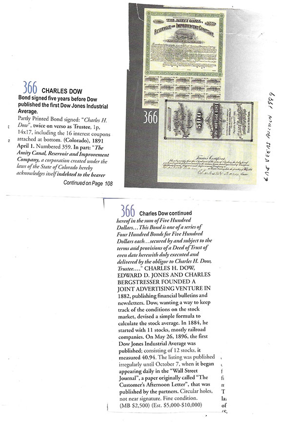 DOW, Charles H. (1851-1902). American economist and publisher along with Edward Jones (1856-1920) established Dow Jones & Company (1882), a publisher of financial news. In 1889 Dow founded The Wall Street Journal. Dow wanting a system to keep track of the conditions of the Stock Market devised a formula to calculate the stock averages starting with only eleven stocks. On May 26, 1896, the first Dow/Jones Industrial Average was published. Scarce, partly printed bond signed twice “Charles H. Dow” on the verso as Trustee. Folio, with coupons attached at bottom. (Colorado) 1st day of April 1891. This bond is a $500 bond for The Amity Canal reservoir and Improvement Company. A six percent First mortgage Bond and the principal paid April 1, 1901 at the Chase National Bank in New York. A very similar certificate was offered in 1999 at auction with an estimate of $5,000-$10,000 (see illustration). Easily frameable when folded. In fine condition..................................$1450.00