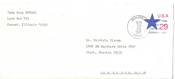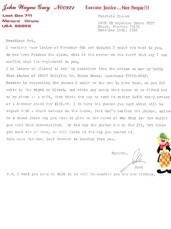 GACY, John Wayne (1942-May 10, 1994). American serial killer who is also known as the “Killer Clown.” He was convicted of sexual assault and murder of at least 33 teenage boys and young men. The killings took place between 1972 and 1978, in the Chicago area. Twenty-six of Gacy’s victims were buried in a crawl space under his home. Three others were buried on his property and the last four were dumped in the Des Plains River. Gacy was convicted of the 33 murders and sentenced to death for 12 of them. He spent 14 years on death row before being executed by lethal injection. Typed letter signed on his desirable prison letterhead, John Wayne Gacy NOO924 Execute Justice...Not... People!!! Dated November 10, 1991. He writes in part: “ ...so you have Patches the Clown, what is the number on the back? That way I can confirm that its registered to you. I no longer am allowed to sell my paintings from the prison so now my buddy....However in requesting the photos I would be the one to have them...any money that comes to me direct has to be given as a gift, the that’s the way to send it either 3 $50 money orders or a cashier check for $150.00 ...Just don’t mention the photos, unless in a round about way,,,,By the way the photos now go for $35, but since you want six of them we will leave it the way you quoted it......Regards, John.” A full length, color clown sticker, is affixed to this page next to Gacy’s signature. In fine condition along with the original envelope...........................$350.00
