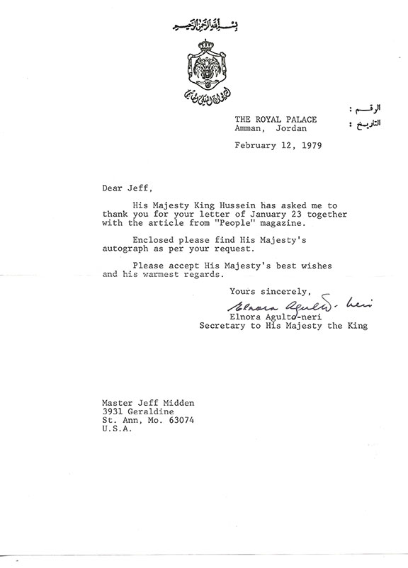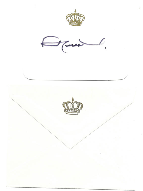 HUSSEIN of Jordan, His Royal Majesty King (1935-1999). King of Jordan (1952-1999). He is remembered for guiding his country through turmoil to become an oasis of peace in the Middle East. He is also known as “The Father of Modern Jordan” and “The Human King.” Hussein is the 40th generation direct descendant of the Prophet Muhammad. His scarce original Royal visiting card, signed with original envelope. Together with a letter from The Royal Palace, Amman, Jordan, February 12, 1979 by his secretary sending this card. All three items in fine condition..........................$185.00