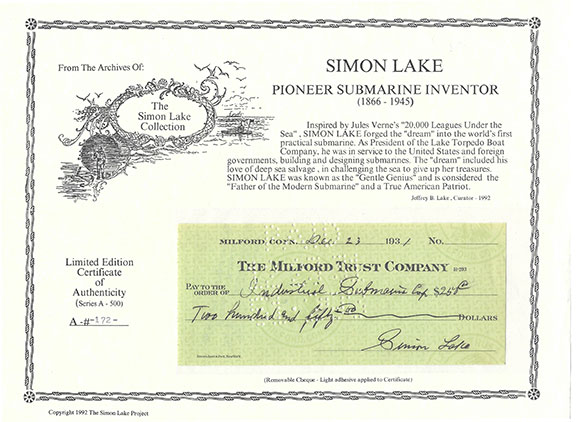 LAKE, Simon (1866-1945). Developed the first submarine to operate in the open seas. President of the Lake Torpedo Boat Company. Considered the “Father of the Modern Submarine.” Limited Edition Certificate #174 of 500 regarding Simon Lake being the Pioneer Submarine Inventor. Lightly affixed to the certificate is his check on The Milford Trust Company, June 22, 1940 made out for $3.20 to Edgar T. Clark. Fine signature of Simon Lake .............$75.00