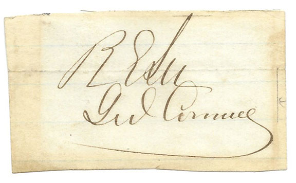 LEE, Robert E. (1807-1870). Confederate General and military leader of all Confederate Forces. He attended both of Harpers Ferry and the secession of Texas. Early war time signature “R.E. Lee Genl Comm” on a lined slip measuring 2.5”x1.5” with ample room for matting and a frame. In near fine condition................$3250.00![]() |